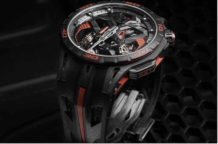 罗杰杜彼Excalibur One-Off从兰博基尼Lamborghini 全球定制一辆的SC18 Alston的设计取得灵感,推出了目前罗杰杜彼最强大最复杂的手表之一。