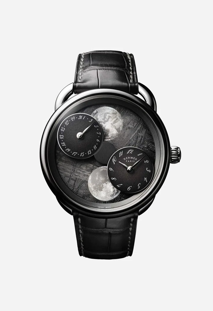 爱马仕(Hermes)全新Arceau系列L'heure de la lune 月读时光腕表,让人能一目了然同时查看北半球与南半球的月相显示。这款以砂金石打造的表盘上,两个围绕盘面运转移动的显示时间的副表盘随着搭载于爱马仕自制机芯中独创机制的节奏,显露出珍珠母贝精制的月相盘。只要仔细观察位于12点钟的月相盘饰上还绘上了一个飞马(Pegase)造型。那是著名插画家Dimitri Rybaltchenko 的佳作,也为这款机械腕表注入了梦幻气息。