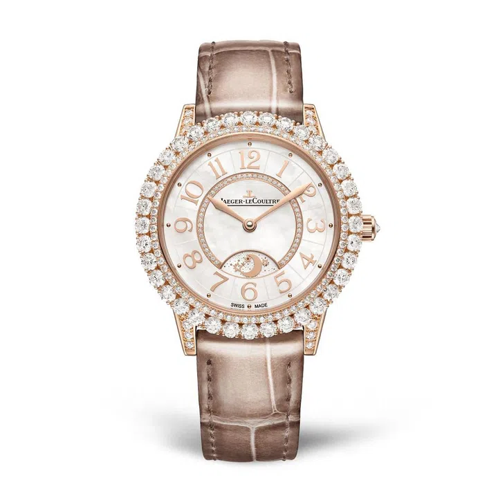 积家(Jaeger-LeCoultre) Rendez-Vous Night & Day约会系列日夜显示珠宝腕表推出白金款和玫瑰金款,搭配相应的鳄鱼皮表带,以全新设计呈现经典的日夜显示功能。腕表将金、珍珠母贝与钻石三种珍贵材质相结合,以精致入微的设计细节,打造和谐均衡的整体效果。