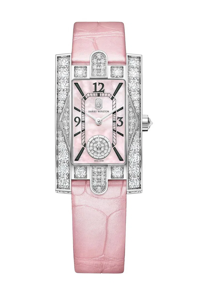 海瑞温斯顿(Harry Winston) 第五道Avenue Classic系列腕表搭配白18K金材质,粉色珍珠贝母表盘镶有明亮式切割钻石,以利落线条设计结合夺目钻石,再现城市建筑之美。