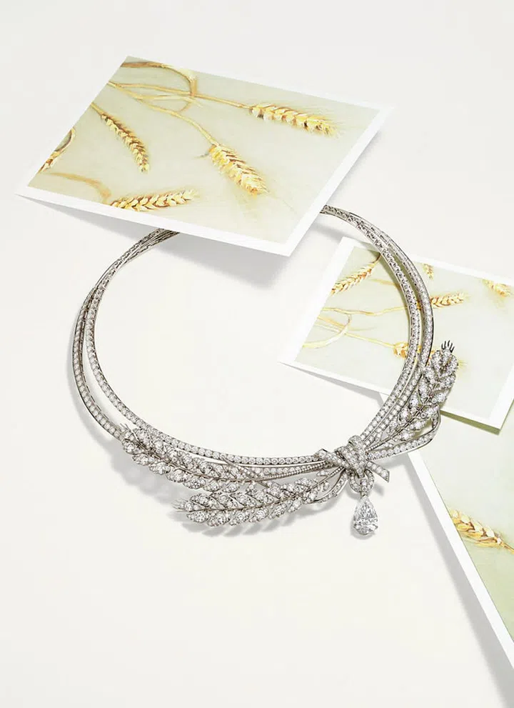 麦穗 (L’Epi de Ble de Chaumet) 也是这个自然系列的主旋律。金灿灿的麥穗象征生命、丰饶的大地和丰收。代表丰收的女神Goddess Ceres更因含有繁衍之意,成为了母爱的延伸。系列中的Moissons sousle vent 以夏日微风为主题,选用黄金和钻石凸显上世纪80年代的古典风格,这组设计包括两枚胸针、两对耳环和一枚浮动式陀飞轮腕表。名为Offrandes d’ete的组套,以9件珠宝展现刚收割的麦穗,镶嵌的钻石代表明亮而饱满的稻米。这个款系包括一条项链、一枚冠冕、3枚戒指、一枚胸针、两对耳环和一枚精致珠宝表,当中有些设计像盈巧高雅的花束,或彷如迎风摇曳的麦株。Champs de lumiere这组设计系列以小麦图案呈现的手镯、戒指与耳环,在橙粉红的帕帕拉恰蓝宝石承托下,散发如阳光般耀眼的光芒。