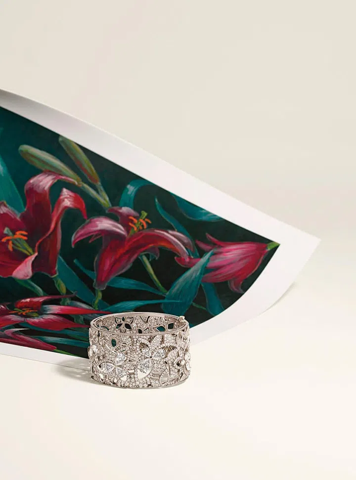 另一组名为Etoiles boreales的设计系列,凸圆形切割黑蛋白石和帕拉伊巴碧玺,搭配黄与紫色蓝宝石,精致诱人。这组设计包括可转换的项链、胸针、手链、耳环和指环。还有一组名为Songe de nuit的设计,以百合的六片花瓣为灵感,白色的主调镶嵌上令人目眩的钻石,通透的镶嵌技术让手链、指环与一对可转换的耳环,低调地展着高贵优雅特质。