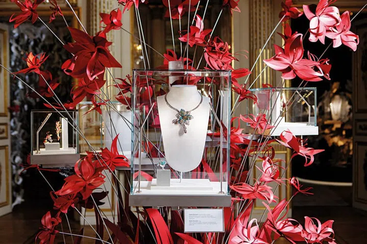 全系列64件作品,继而在芳登广场12号的品牌大宅灿烂开绽。二楼的大堂走道,由法国知名剪纸艺术家以艺术剪影呈现的装置,彷如一个大花园,有麦穗、有百合、还有桂树和橡树,迎风摆荡,色艳缤纷,非常引人入胜又赏心悦目。穿越这个缤纷走道进入珠宝发布会场,四大主题区再以不同的剪纸艺术,让珠宝在橱窗里精致呈现。