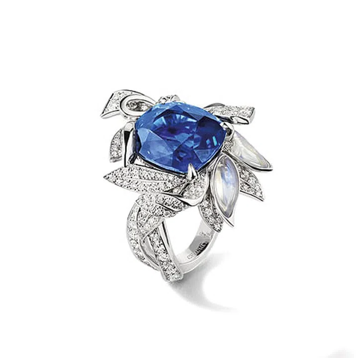 月桂系列中的Firmament Apollinien戒指, 以天蓝色的缅甸蓝宝石和乳白蓝月长石为亮点。