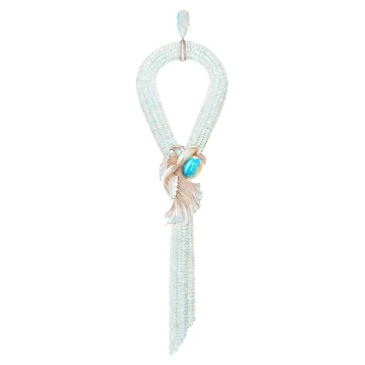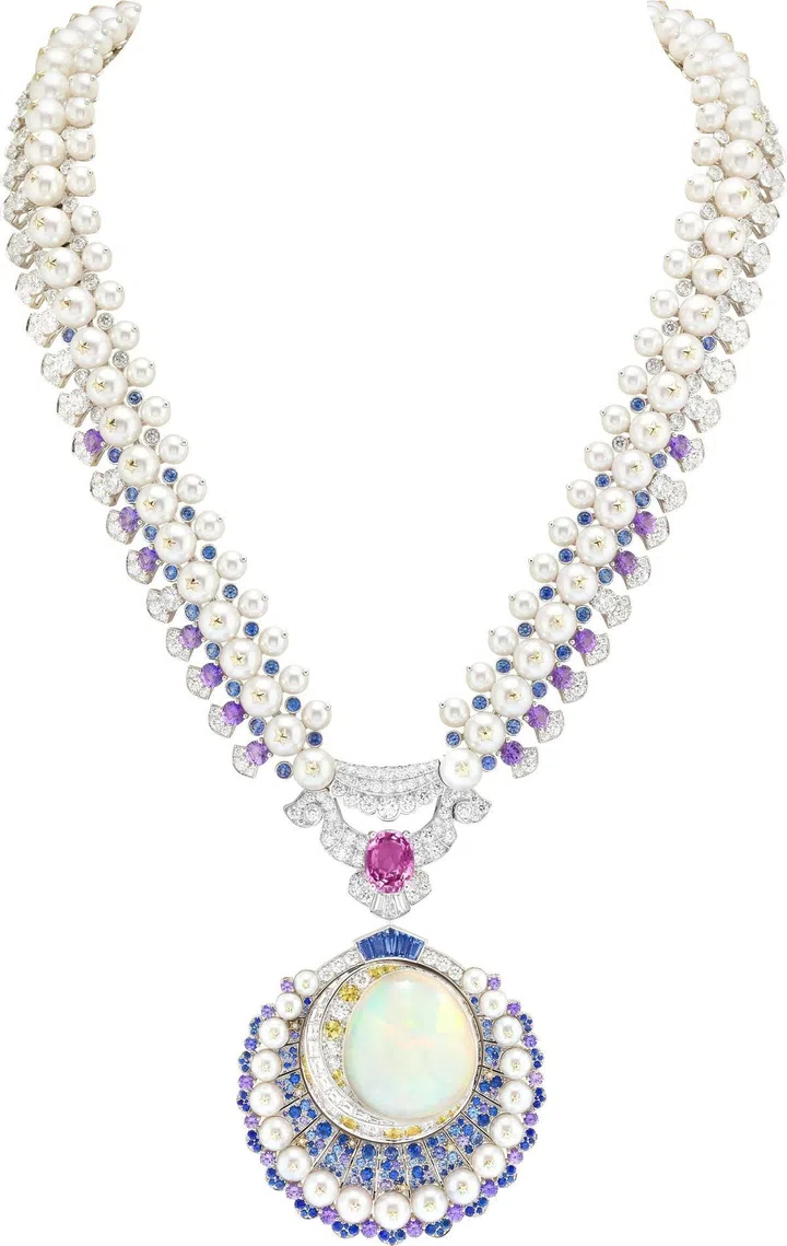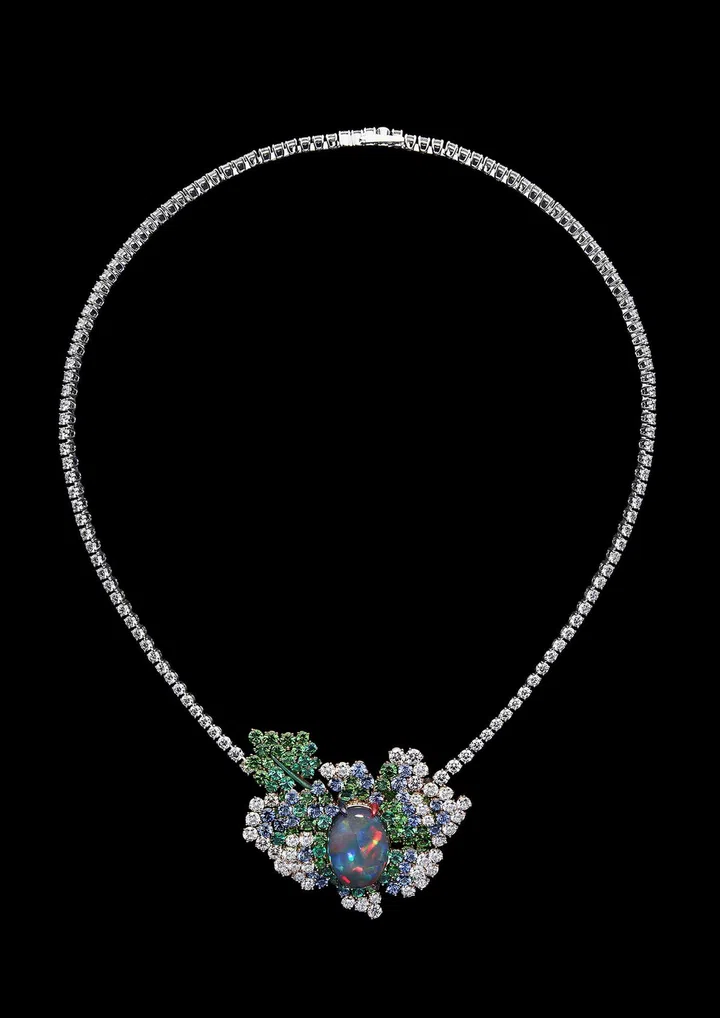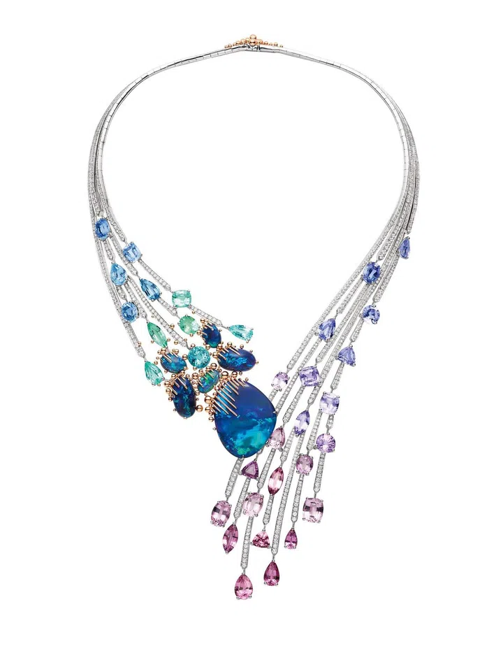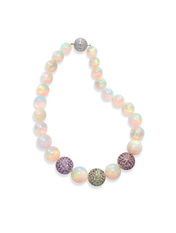 Carte Blanche - Holographique高级珠宝系列Opalescence可转换式项链,玫瑰金镶嵌1颗71.69克拉的蛋面切割埃塞俄比亚白欧泊、1颗46.91克拉的蛋面梨形切割埃塞俄比亚白欧泊、欧泊石珠子(总重量1518.78克拉),缀以漆面/Boucheron。