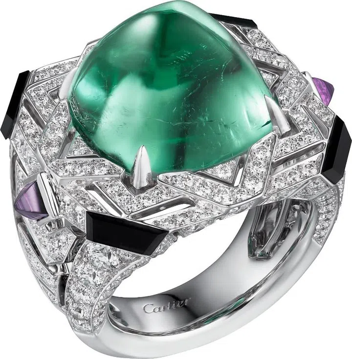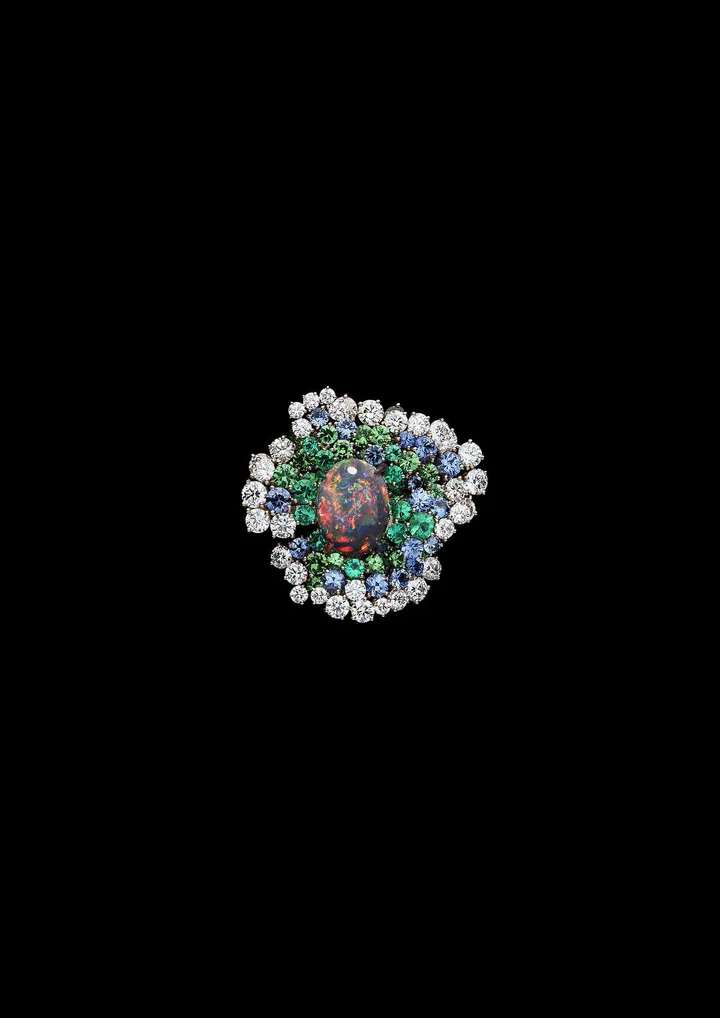 Carte Blanche - Holographique高级珠宝系列llusion 白金戒指镶嵌1颗10.38克拉的蛋面梨形切割澳大利亚深色欧泊石,同时镶嵌红宝石,粉色、橙色、黄色及蓝色蓝宝石,红色石榴石、沙弗莱石以及钻石/Boucheron。