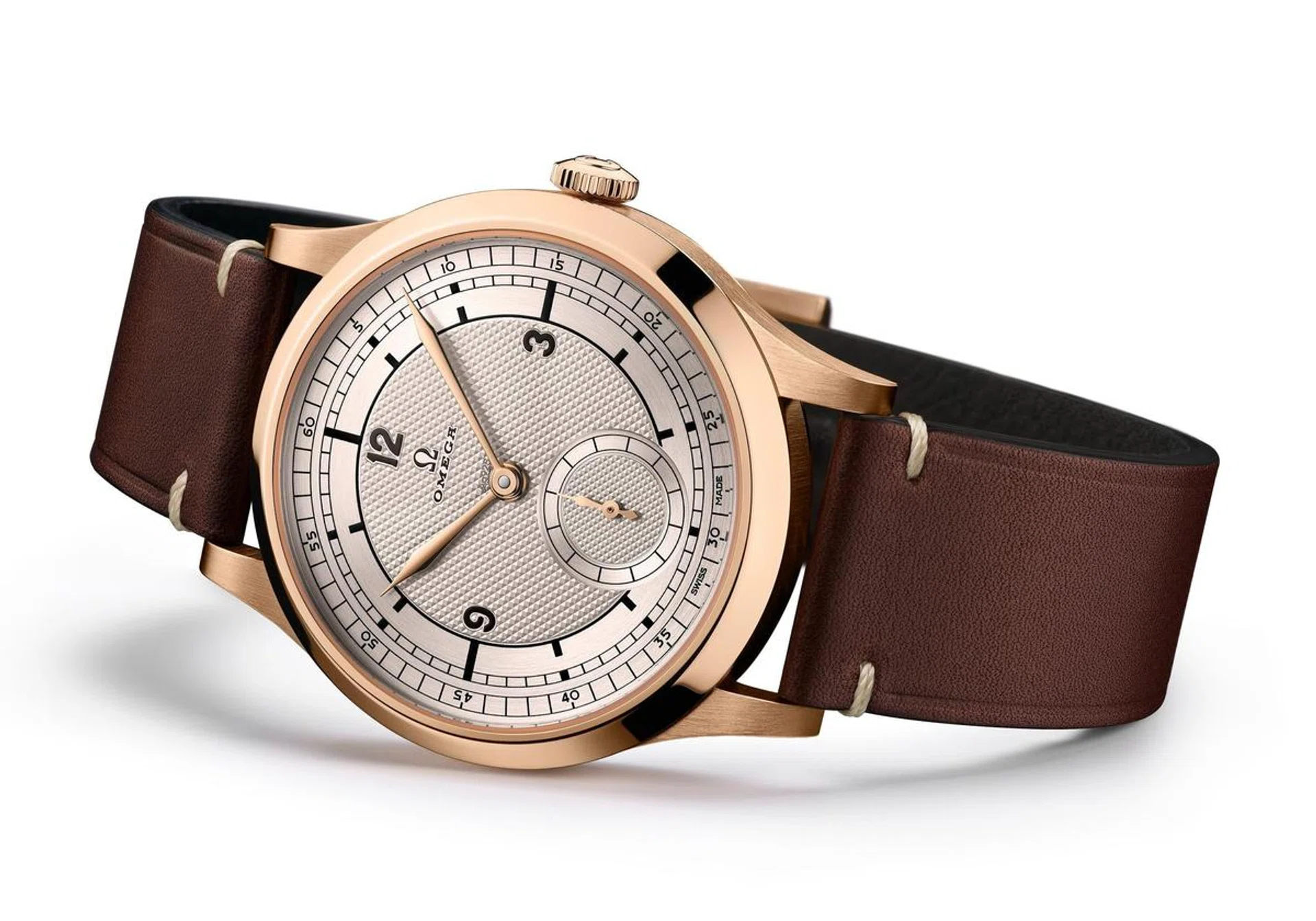 腕表设计处处可见复古风格的欧米茄品牌标识,表冠、表扣和表盘分别饰以浮雕、抛光浮雕和深灰色品牌标识。表盘饰以奢华法式风尚的经典象征:“巴黎饰钉”纹理。6点位设有小秒盘,而轨道分钟圈和小盘表的环形外圈则经由拉丝工艺处理。