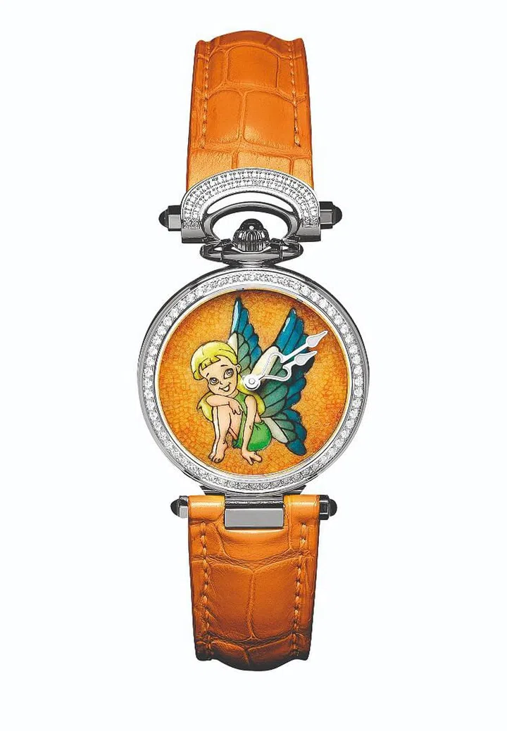 由Pascal Raffy先生构思设计的播威(Bovet)Miss Audrey Sweet Fairy Only Watch腕表选用纯糖材质,体现爱的甜蜜和孩童心灵的纯粹。表盘的制作过程异常复杂。首先,在表盘中央手工微绘精灵,并涂覆Super-LumiNova荧光物料。然后,对表盘进行保护性喷漆,以此确保艺术图案隽永流传。接下来,制备纯糖晶体,使其在光照或加热条件下也不会融化。根据尺寸挑选纯糖晶体,再结合特制橙色环保漆料,由播威微绘工匠手工精心装饰在表盘上。指针造型独特,每当分针与时针相遇,就会形成美丽的心形图案。