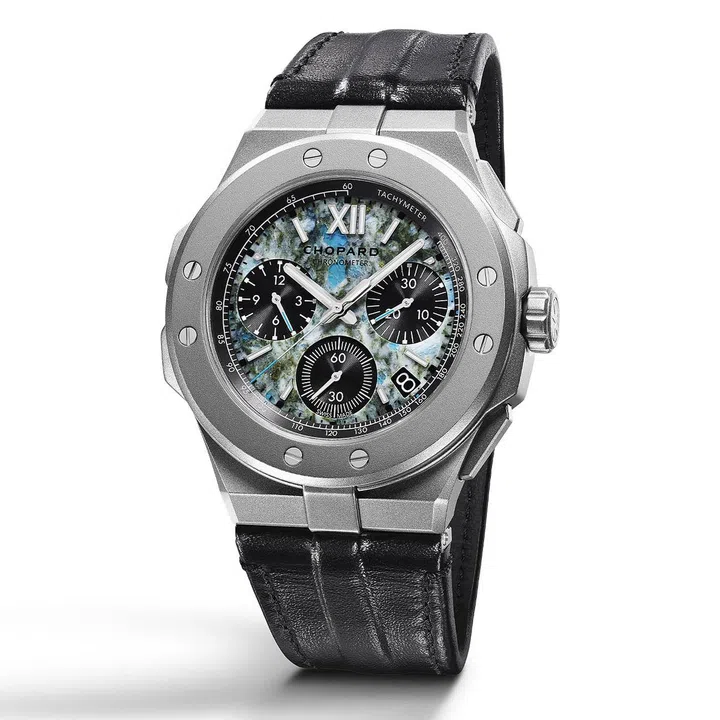 萧邦(Chopard)雪山傲翼系列超大号Only Watch计时码表的表盘独具特色,以格劳宾登地区开采并精挑细选的瑞士天然花岗岩制成,点缀蓝色和绿色内含物,让人联想到鹰隼在天空中看到的美丽的阿尔卑斯山森林和湖泊。这款孤品时计为雪山傲翼系列带来亮相新颖元素:一是喷砂Lucent Steel A223精钢表壳,二是黑色小牛皮表带。此外,为该腕表提供动力的Chopard 03.05-C飞返计时机芯通过瑞士官方天文台(COSC)精密时计认证,并取得三项专利。 表壳右侧,计时按钮巧妙地整合在表冠防护装置的两侧,保持雪山傲翼系列特色的和谐造型和对称性。30分钟计时盘、小秒盘和12小时计时盘分别设于3点钟、6点钟和9点钟位置,精心设计,以黑色装饰,凸显花岗岩的自然色调。表盘外缘标注测速计刻度,在100、160和240刻度处以蓝绿色标示。测速计刻度分为四个阶段,以不同的速度值(5、10、20或40km/h)划分刻度。便于读取平均速度测量值。