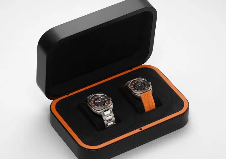 为支持Only Watch慈善拍卖,爱马仕(Hermes)赋予今年推出的H08运动腕表新的诠释。原创的数字设计独树一帜,与腕表整体产生共鸣,数字0和数字8的轮廓呼应表壳的造型。此外,数字0体现虚空,而横向排布的数字8则象征无穷。Only Watch版本结合矿物材料与深邃色调和些许浅橙,以两种全新面貌亮相。第一款采用钛金属表壳,搭配经过PVD处理的表圈。黑色表盘点缀橙色阿拉伯数字,与镜面封装、表背和分钟轨道协调相称,黑色镀镍指针指示小时、分钟和秒钟,日期视窗设于4、5点钟之间。钛金属表链为这款低调而动感的腕表画上点睛之笔。 第二款采用经过PVD处理的钛金属表壳,搭配橙色橡胶表带,凸显表背、镜面封装和分钟轨道。除了耐抗性和舒适性之外,橡胶表带既运动又精致。