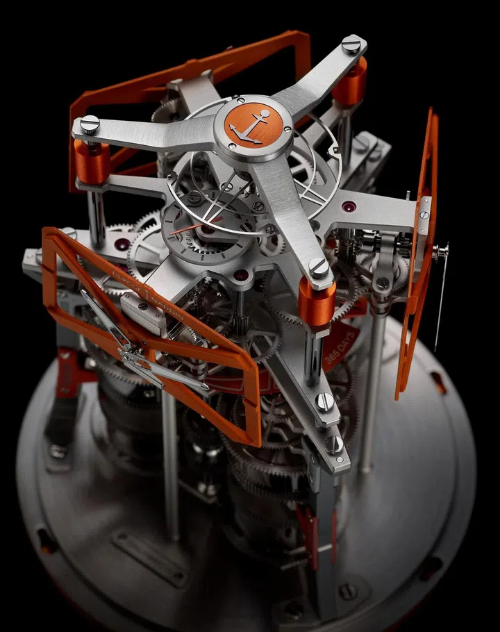 雅典表(Ulysse Nardin)一改以腕表作为慈善拍品的传统,呈献UFO座钟。通过卡榫固定系统与吹制玻璃钟罩连接的球形铝质基座,经由特殊的PVD电镀处理,呈现出活力十足的橙色。机芯中三个起连接作用的圆柱体及下半部分的连接部件,还有动力储存显示盘,以及精心嵌饰的雅典表船锚标识,同样以橙色演绎。此外,三个表盘亦涂覆橙色,但不同于其他橙色细节的金属感,而是展现出低调的哑光质感。