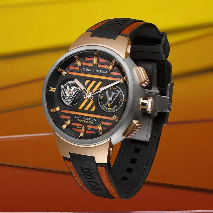 今年是路易威登(Louis Vuitton)连续第六次参与Only Watch慈善拍卖会,品牌此次献出 Tambour Curve GMT 飞行陀飞轮腕表,其设计前卫,造型新颖,堪称路易威登高级制表系列的当代典范之作。腕表从 2002 年发布的 Tambour 系列腕表中汲取创作灵感,由路易威登制表工坊倾情设计、精心研发和匠心制造,其表壳设计醒目有力,其表盘设计精密独特,表盘时标镶嵌有长方形橙色蓝宝石,表盘上红黄渐变之色相映成趣,与第九届 Only Watch 拍卖会上的腕表配色遥相呼应。