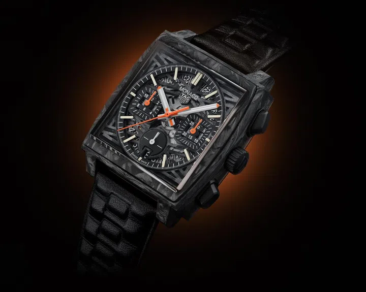 泰格豪雅(TAG Heuer)Only Watch碳纤维摩纳哥腕表的设计呼应被收藏家称为“Dark Lord”的具有神话色彩的摩纳哥系列腕表,其型号为74033N。该腕表于20世纪70年代中期限量生产,但却从未现身于豪雅(1985年之前的公司名)产品目录或公司的任何宣传广告之中。因此,时至今日它异常珍贵,价值斐然。腕表的表壳采用黑色碳纤维材质并由前沿制造工艺制成,表壳由黑色碳纤维材质锻造而成,营造出令人惊叹的神秘外观。引人注目的镂空表盘亦由碳纤维制成,每个复杂镂空切面均以倒角这种制表技艺手工打磨,赋予表盘深邃质感与多维立体感。碳纤维表盘上方采用了三块黑色镀锌铜板,构成了腕表的计时装置和小秒针小表盘。灵感源自2021年Only Watch慈善拍卖会暖阳主题色的橙色元素令指针在黑色表盘上格外醒目,而单独加工而成的时标则覆以高亮的米色Super-LumiNova荧光涂料。