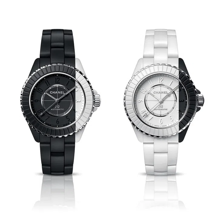 在2021年Only Watch慈善拍卖中,香奈儿(Chanel)提供一组两款J12 PARADOXE腕表作品。独特的设计,亦是对技术的一次非凡挑战:切割黑与白两种颜色的精密陶瓷表壳,再将其重新结合,打造为两款独一无二的表壳。两款腕表皆搭载专为香奈儿品牌制作的Caliber 12.1自动上链机械机芯,该款机芯获得C.O.S.C(瑞士官方天文台检测机构)认证。
