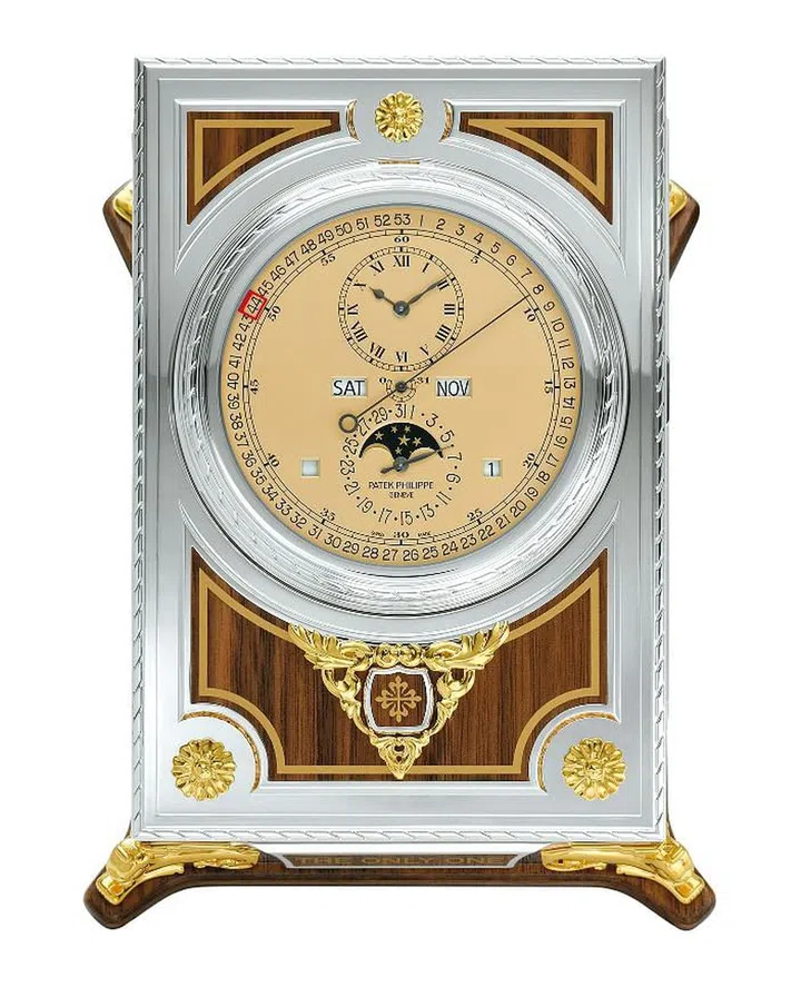 今年百达翡丽呈(Patek Philippe)献Ref. 27001M-001桌钟,形式有别以往。这款独一无二的复杂桌钟,是以百达翡丽博物馆内典藏的一件桌钟为蓝本的创作。原作于1923年由美国汽车大亨、也是知名百达翡丽藏家James Ward Packard典藏。Ref. 27001M-001搭载全新的机械机芯86-135 PEND IRM Q SE,备有万年历、星期显示、6点钟位置月相显示、最外圈周数显示、以及中央31日动力储存显示功能。外盒由纯银打造,镶嵌美国胡桃木,并装饰立体的鎏金银藤蔓植物与动物图腾。
