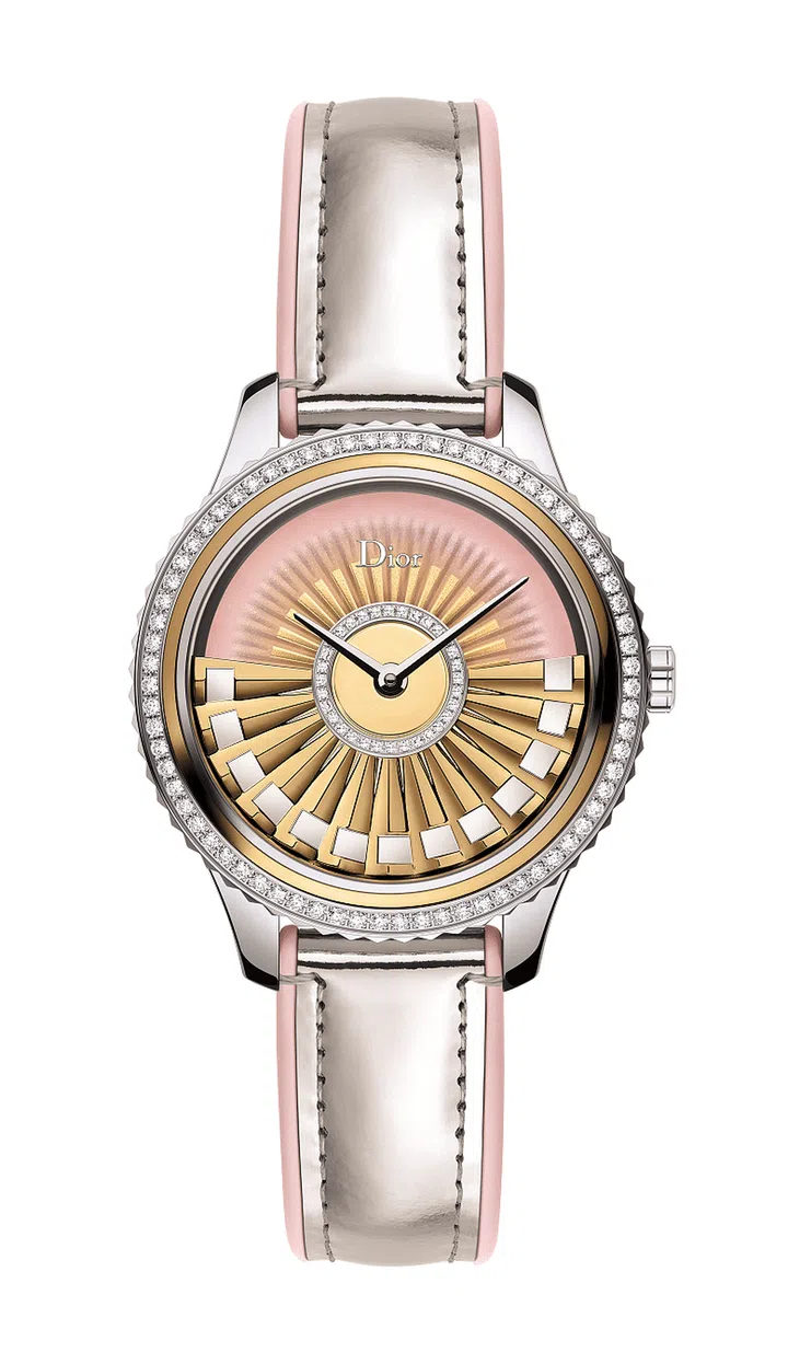 迪奥今年的腕表离不开钻石,而其中最夺人眼球的当属这只。延续VIII系列的一贯风格,搭载Dior Inverse 11 ½自动上链机芯,18K白金镶嵌钻石,表盘金色与粉色相间非常显层次,配上银色的表带,未来感十足。表带是银色牛皮加粉色橡胶,不失少女的可爱。