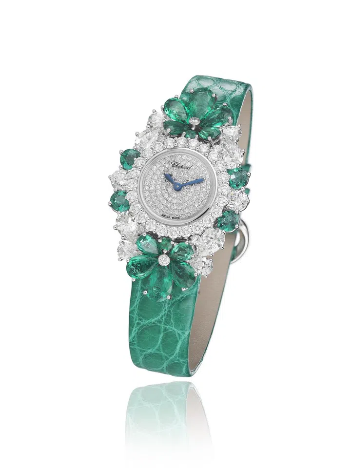 当然,我们也不可能遗漏萧邦(Chopard)。本届巴塞尔钟表展期间,品牌推出了For You高级珠宝系列,其中有两款为高级珠宝腕表。此系列以春天为灵感,以“樱花”为主题,这款珠宝腕表以圆形明亮式切割和梨形切割钻石及祖母绿勾勒出两朵清雅的樱花,搭配绿色绢质表带,与表壳上的祖母绿相得益彰,特别贴切主题。