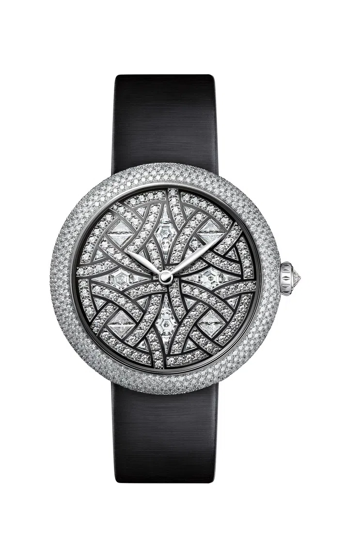今年,它又以全新的造型亮相巴塞尔:18K白金表壳,铺镶552颗明亮式切割钻石(约3.03克拉),搭载自动上链机械机芯,18K白金表冠镶嵌一颗钻石(约0.19克拉),表盘镶嵌明亮式切割钻石、梯型切割钻石及特殊切割(2.68克拉),黑色镀铑饰以白金线,黑色丝缎表带及18K白金双层折叠式表扣,镶嵌80颗明亮式切割钻石(0.48克拉),限量编号发行5枚。