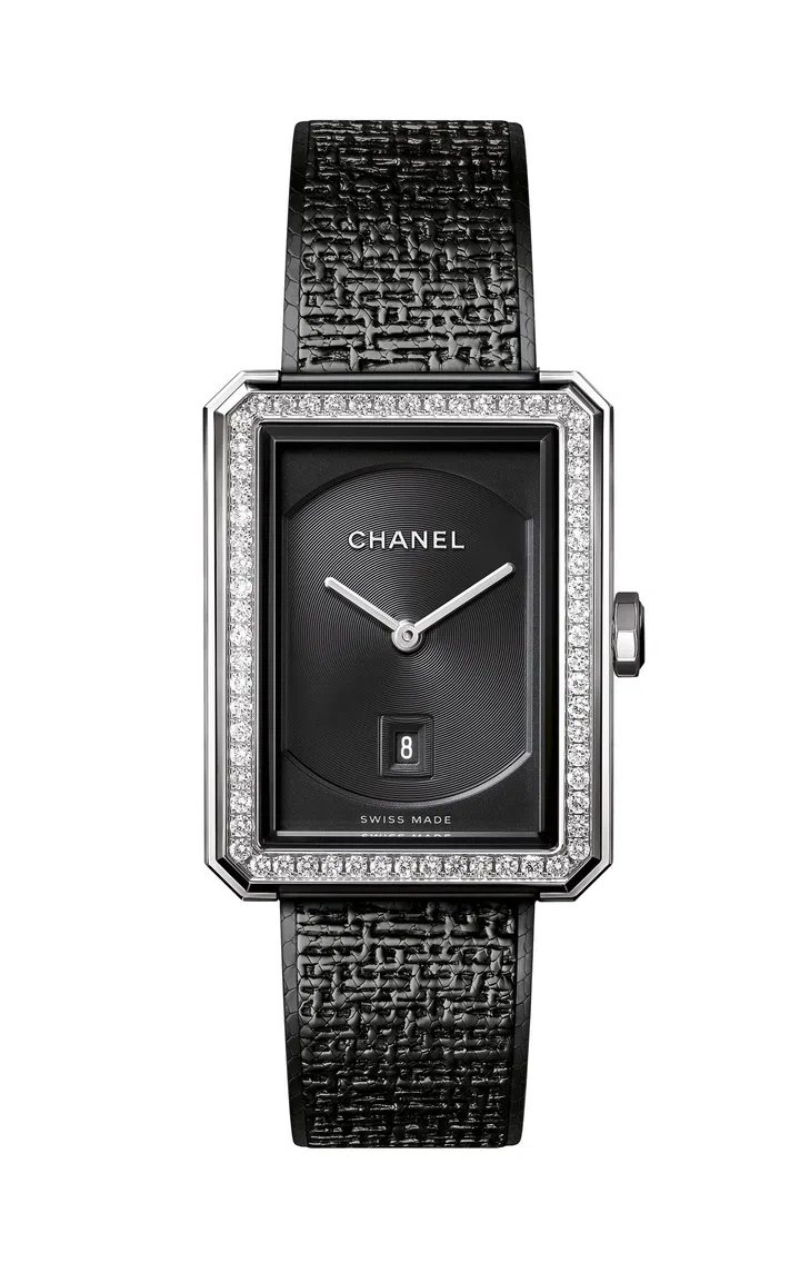 帅气而富有魅力,极具阳刚之美的Boy·Friend来到了巴塞尔,精钢丝线编织而成的雕饰表带变成了黑色,这个灵感来源于香奈儿女士挚爱的男性服饰元素,为了凸显斜纹软呢面料的丰富层次,在表带上精确深压出了细致的纹理;同时,又保持了表带绝佳的柔韧性,以确保佩戴时的舒适度。精钢的表圈镶嵌着64颗明亮式切割钻石,在表现中性气质的同时又不失女性柔美气息。