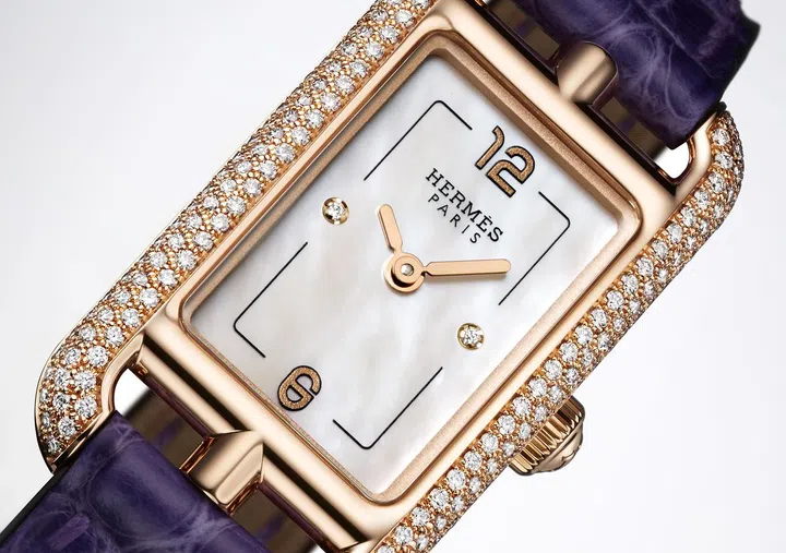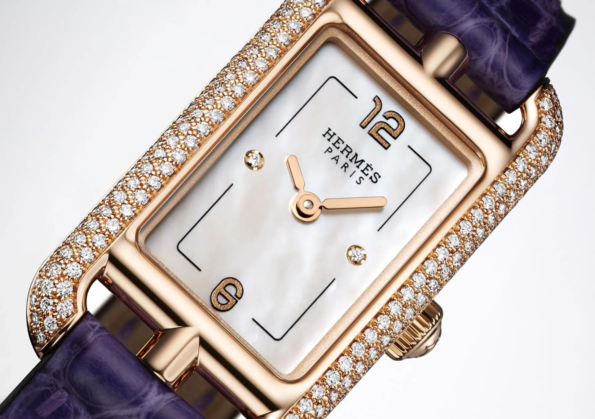 似乎超小号的腕表现在已经成为趋势。爱马仕(Hermes)在1991年邀请Henri d’Origny设计方形腕表,由此诞生了拥有纤长外形结合“锚链”装饰的 Cape Cod 腕表。而现在,品牌将原始设计缩小,这只特小号(TPM)腕表则更突显原始设计的轮廓。玫瑰金镶嵌钻石,与珍珠母贝表盘交相辉映。搭配色彩艳丽的单圈或双圈皮表带,更显优雅。
