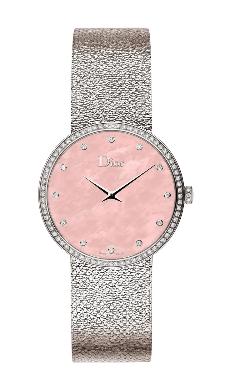 说到珠宝腕表,当然少不了迪奥的La D de Dior系列,延续此系列的高雅风格,生动呈现了Dior珠宝工艺的精华,比以往Satine系列拥有更大的表盘,粉色的珍珠母贝表盘上自然的纹理清晰可见,搭配米兰式织网表链,以其特有的制表元素展现出丝绸的柔顺与光亮。