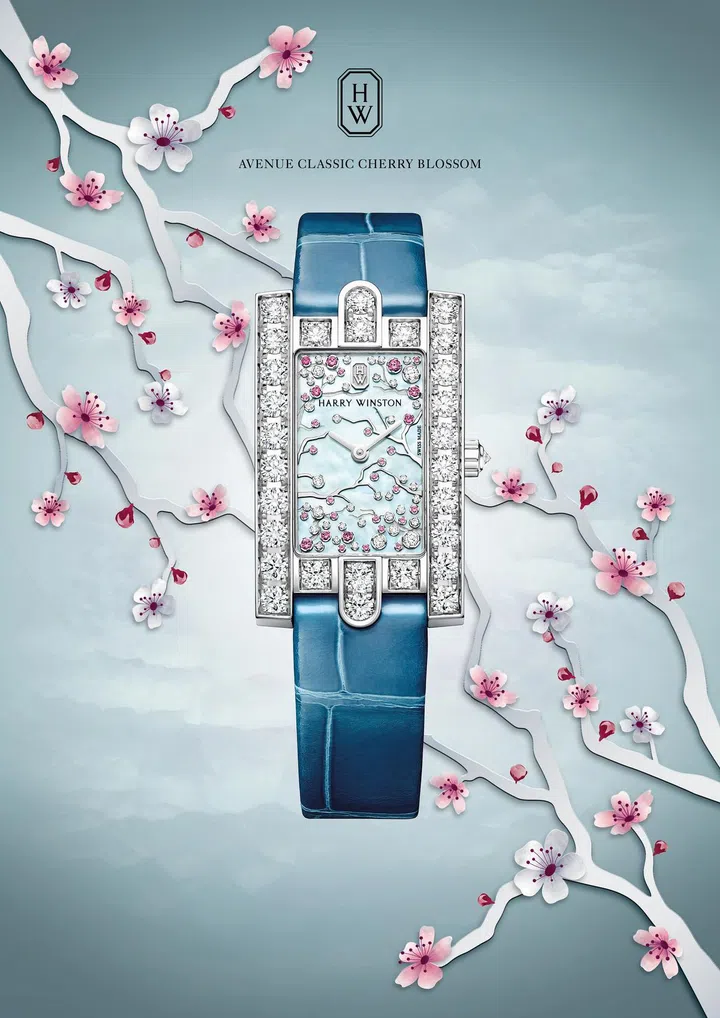 淡蓝色的珍珠母贝表盘上错落有致地镶嵌着39颗白钻与29颗粉色蓝宝石,刻画樱花盛开时树梢绽放的花朵与随风飘落的花瓣,它们被切割成了大小不一的造型,为画面增加了深邃与灵动之感。这是一只充满诗意的腕表,18K白金表壳与表盘美景相映成趣,造型取材于品牌位于纽约第五大道精品店的石砖砌成的门,表壳上镶嵌着29颗明亮式切割钻石。