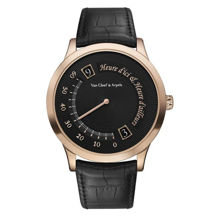这是梵克雅宝为旅人设计的双时区自动上链腕表,品牌经典男式腕表的Midnight表壳首次搭载双时区自动上 链机芯,由梵克雅宝与Agenhor (Atelier Genevois d’Horlogerie) 工坊携手研发。Heure d’Ici即所在地时间,显示于表盘上方;而Heure d’Ailleurs ── 第二时区时间,则呈现于表盘下方的视窗中,两者透过单一机械组件带动两组小时转盘与逆跳分针同步运行,确保两地时间的精确显示。