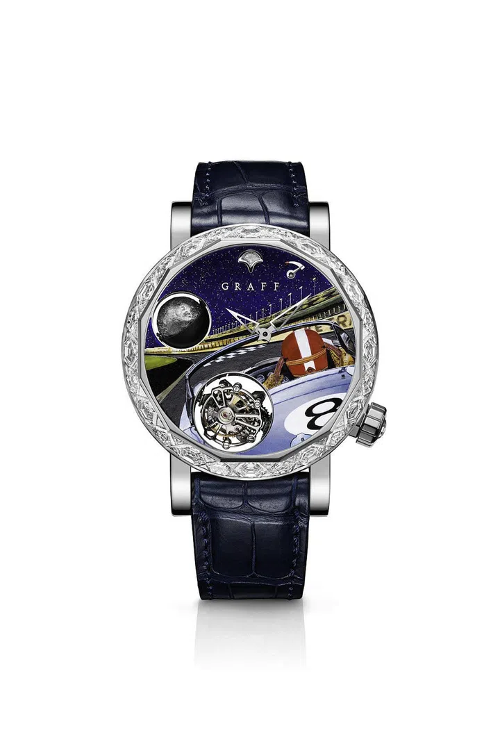 格拉夫以赛车为主题的GyroGraff腕表,以全新角度刻划在赛道上飞驰的瞬间。其中一枚腕表以古董赛车为主题,车身饰以8号的车手编号,而车手与方向盘则以多层镂空贴饰镶嵌而成,再运用微绘工艺塑造立体层次与亮丽色彩。这只腕表非常适合送给爱看赛车的父亲。