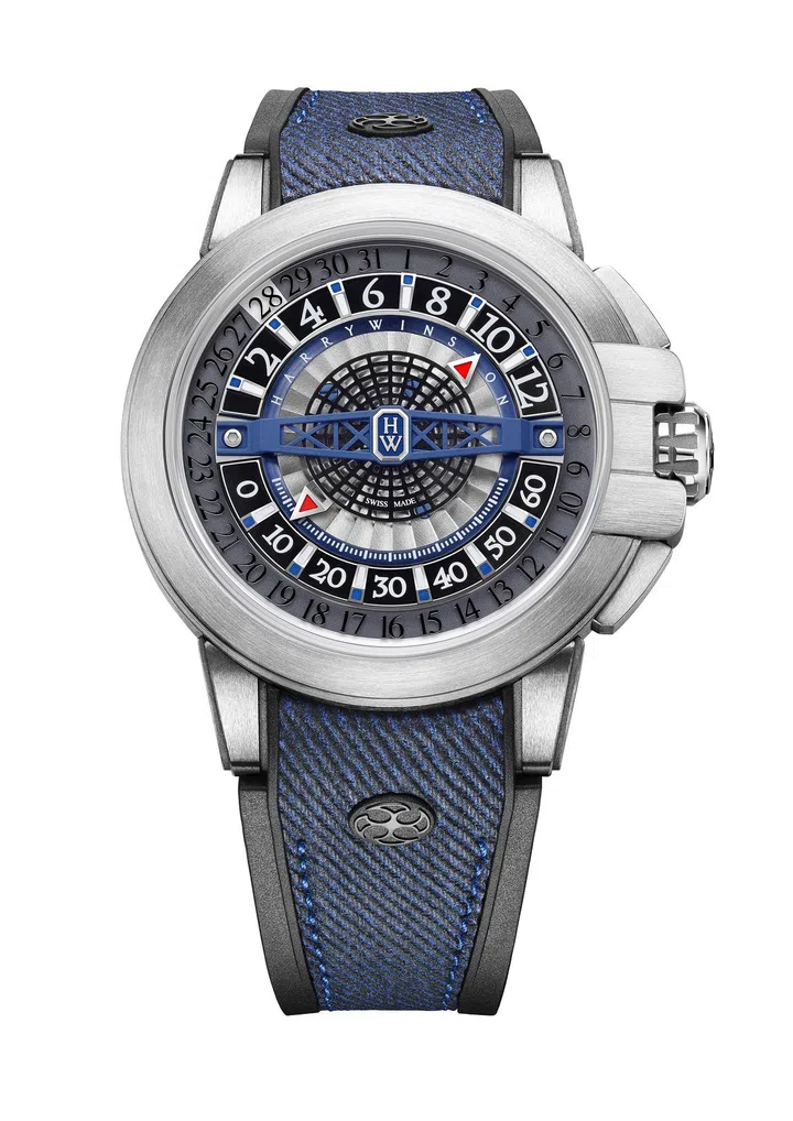 Project Z系列在海瑞温斯顿腕表中象征着运动与创新风范,Project Z12腕表配备 性能优异的品牌专属锆合金Zalium材质表壳。逆跳小时显示和逆行分钟功能巧妙搭载于表盘中央圆盘,蓝色网格表桥向品牌诞生地纽约的著名吊桥致敬,设计非常独特。