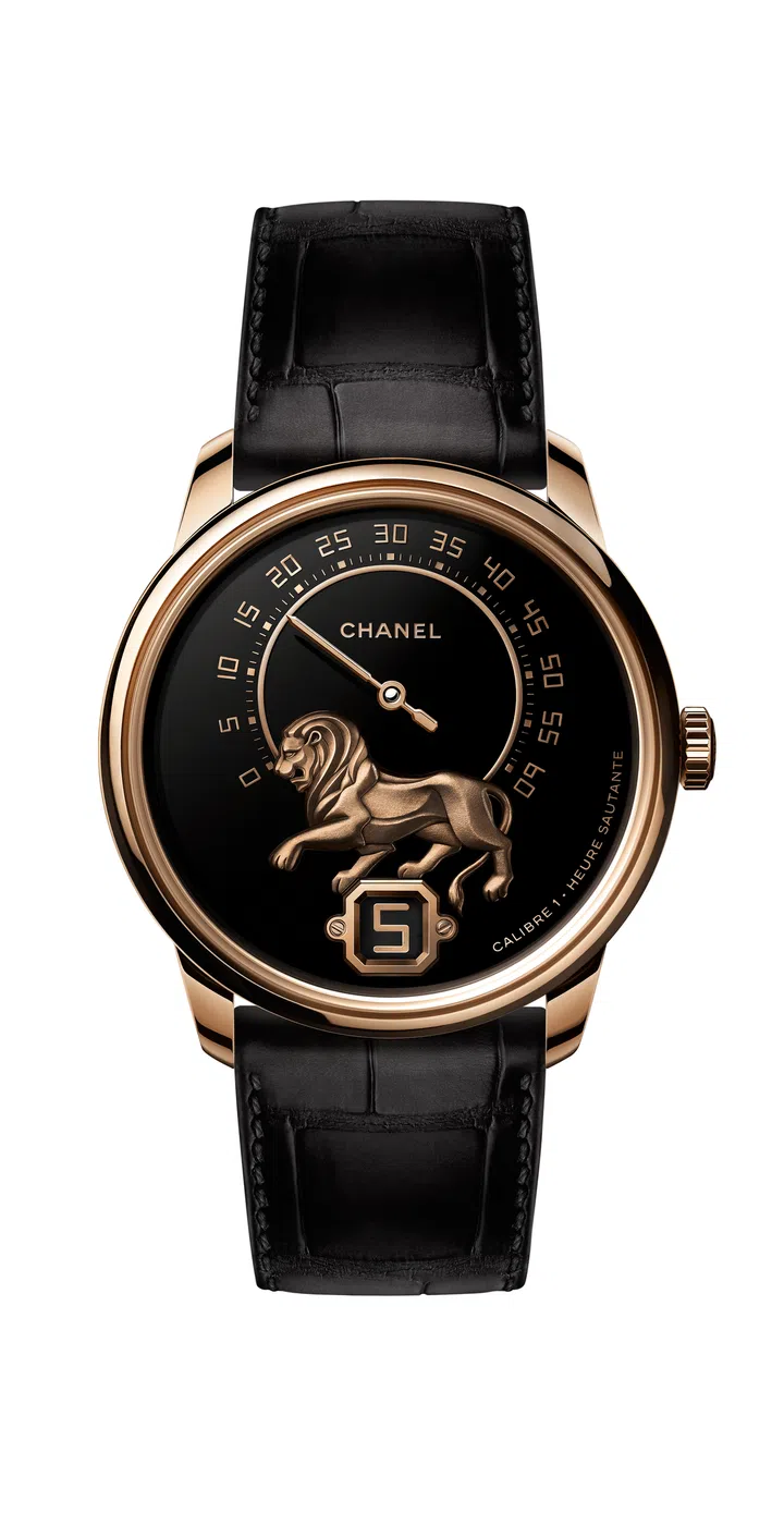 2016年,香奈儿呈献Monsieur系列腕表,一款专为男士打造的腕表。2018年,香奈儿将狮子图腾融入该系列,18K金狮子微雕在黑色大明火珐琅表盘上惟妙惟肖。腕表搭载两项复杂功能——瞬间跳时和240度飞返分针功能,让其彰显非凡魅力。