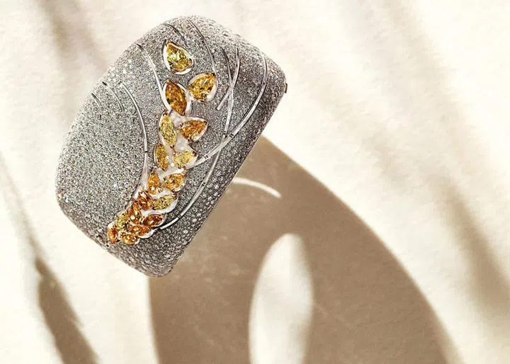 Chanel全新顶级珠宝“Les Bles de Chanel”,全系列62款的作品,柔美灵动,和品牌一直以来的强势风格非常不一样。整组设计大量用上钻石与彩钻,尤其是黄钻,几乎抢尽了白钻与珍珠的势头。还有大量以马眼形切割的钻石,一颗颗就像麦穗一样优美灵动,与黄、蓝宝石,橄榄石、水晶与海蓝宝石等互为搭配,通过精雕细琢的镶嵌工艺,巧妙运用空间感与层次感,变化出与别不同的透视效果,更让人惊讶麦穗可以开展出如此这般的多样风情。