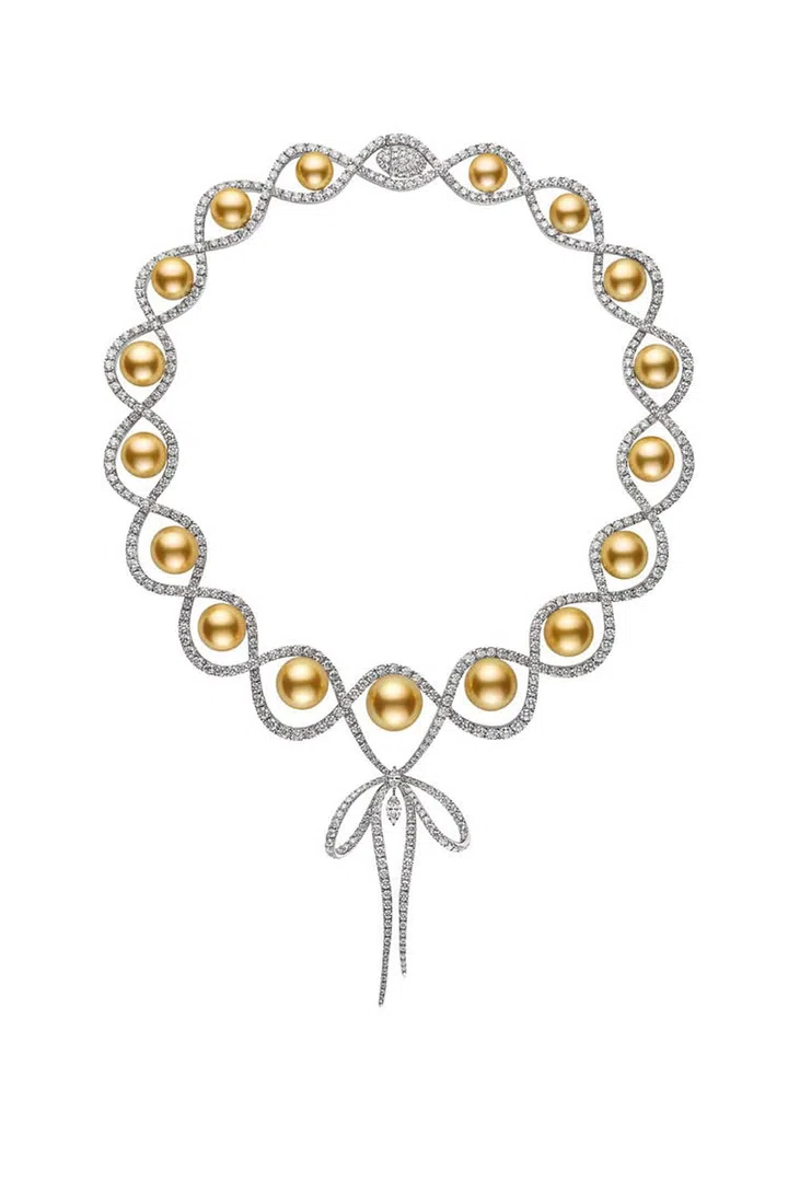 Mikimoto推出的珍珠设计中,一款总重31.57克拉的钻石项链,镶嵌17颗直径10.5至15毫米的金色南海珍珠,下方扭成蝴蝶结,并附有18K白金扣环,将珠光宝气展现得淋漓尽致。