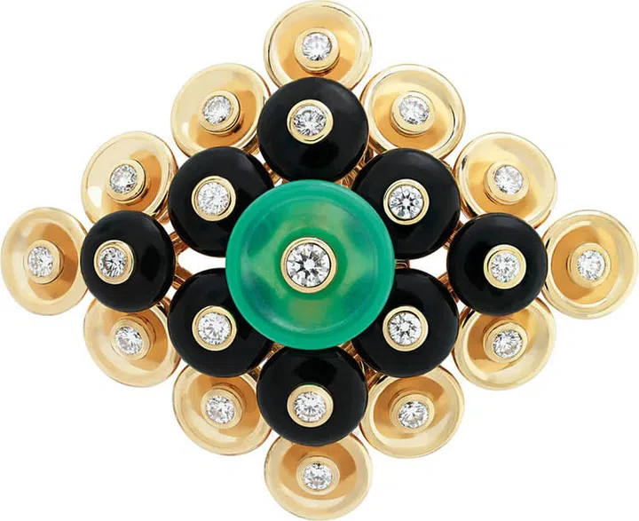 Van Cleef & Arpels就在这股怀旧热潮中寻来创意新灵感。名为“Bouton d’or”的珠宝系列,将1930年代末惯用于高级定制服上的装饰亮片Paillette重新演绎,化身为以贵重金属打造的圆形饰片,精准展现40至50年代的奢华氛围。以色彩宝石像绿玉髓、黑玛瑙、贝母等,结合凸面和凹面组件的层次变化,展现出异常丰富的视觉效果。
