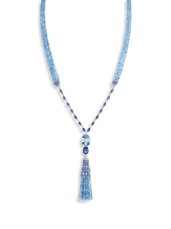 Tiffany & Co.的2016年度Blue Book系列以“The Art of Transformation”为主题,透过硕大色彩宝石与钻石,展现自然界万物幻变的无穷魅力与艺术张力。匠心独运的新作中,一款以马蹄形切割钻石和色彩宝石镶嵌而成的三环项链,中央垂悬一颗重达52.80克拉海蓝宝石,展现着像海洋一样温柔的光芒,好莱坞Diane Kruger就曾以一袭红装配搭这款璀璨项链,抢尽风头。