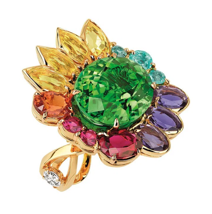 Christian Dior儿时居住在位于法国诺曼底临海小镇Granville的花园别墅Les Rhumbs,母亲Madeleine是园艺师出身,在买下这座悬崖上的别墅之后,将之打造成为风格纯正的“英式花园”。被奇花异草围绕,Dior先生自小便对植物有着无尽的爱慕之情,花园中缤纷的花卉也成为了他无限的灵感来源。珠宝创作总监Victoire de Castellane从Dior先生的童年故地汲取灵感,捕捉孩童的纯真趣味,推出Graville高级珠宝系列,用绿柱石、橄榄石、海蓝宝石、坦桑石、金绿宝石、粉红色碧玺、红色碧玺等五彩斑斓的宝石,通过不同的镶嵌及切割工艺互相拼接搭配,碰撞出独特的火花,充满着童真和创意。