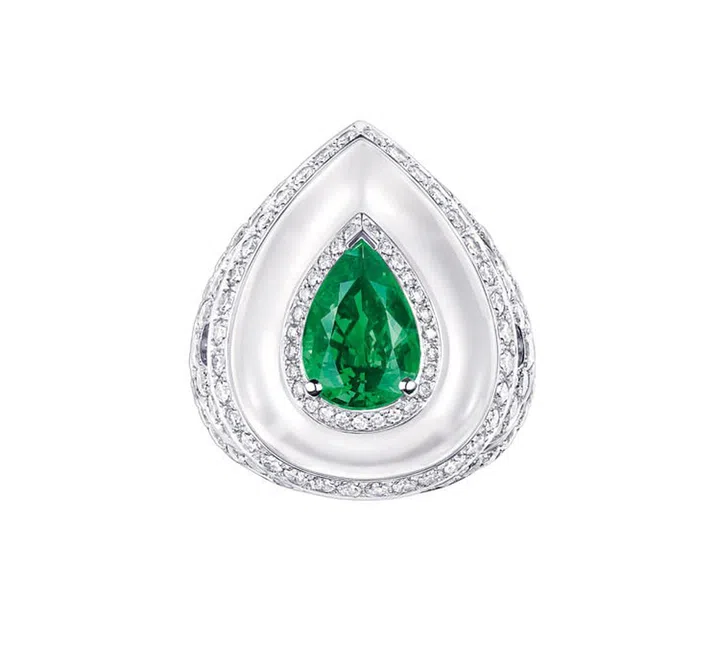 Emeraude en Majeste是Van Cleef & Arpels全新推出的祖母绿高级珠宝系列,精选来自哥伦比亚及赞比亚色泽丰润,优美而硕大祖母绿,经过工匠的细心雕琢和切割,衬以钻石或珍珠,成为品牌又一个亮眼杰作。设计中最耀眼的是名为Grand Opus 的项链,3颗总重达127.88克拉的雕刻祖母绿,在白色珍珠与圆钻承托下,散发着温婉柔美的光芒。
