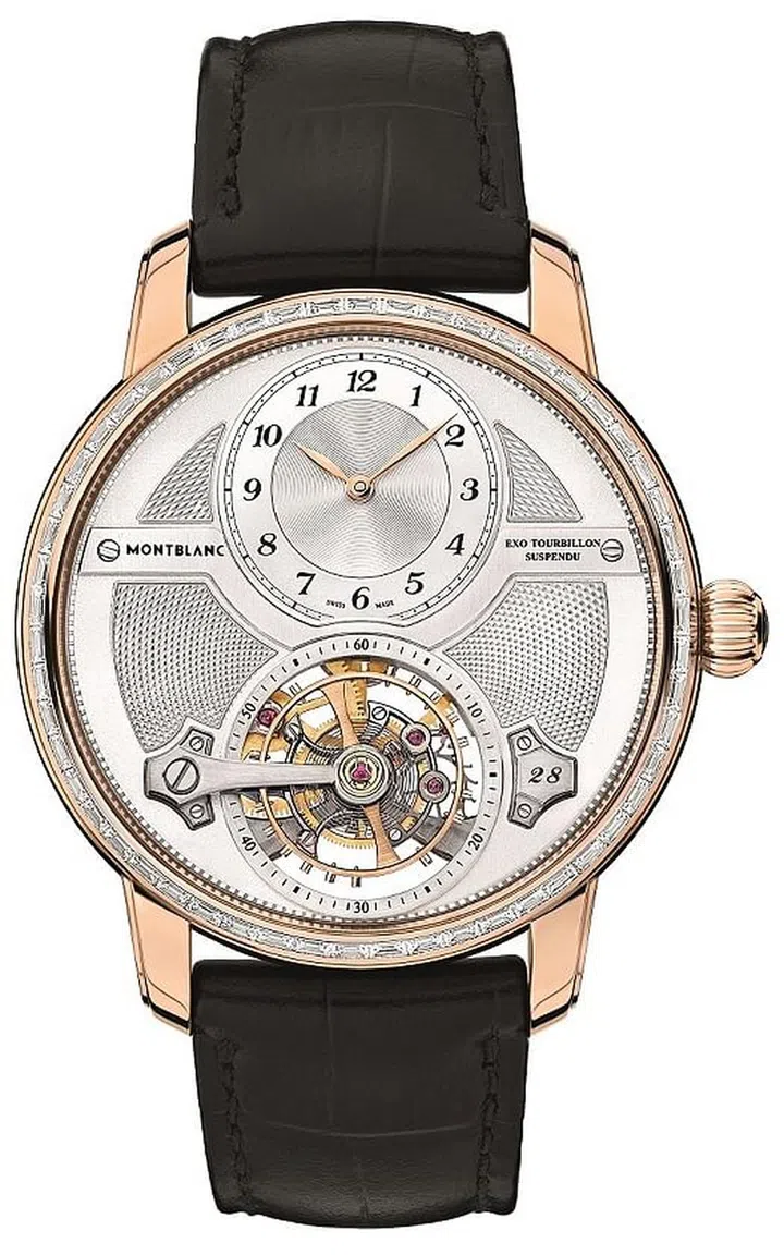 这一系列的最大亮点就是限量58枚的单臂悬浮外置框架陀飞轮腕表(Star Legacy Suspended Exo Tourbillon Limited Edition 58),由万宝龙维莱尔(Villeret)表厂的制表大师历经三年自主研制。“Exo”字根由希腊文衍生而来,意为“外部”或“外侧”,指将大螺丝摆轮置于陀飞轮旋转框架外侧。这一特殊的专利结构令万宝龙维莱尔表厂的制表大师无需增大机芯或表径,便能为陀飞轮装置配备大尺寸平衡摆轮,这个摆陀就悬浮于表盘上方3.2毫米处,全新设计的陀飞轮板桥,仅由一只弯曲精钢支臂支撑,并与12点钟位置的穹形小时刻度圈相呼应,所营造出的三维立体造型非常惊艳。外置框架陀 飞轮的复杂性在于长轴尺寸务必极度精准,加之复杂结构本身,这要求平衡轴必须与机芯完全垂直。差之毫厘谬以千里,令人感叹制表师的高超技艺。这只腕表的镶钻款限量28枚,表壳上镶嵌了54颗方形切割钻石,璀璨的钻石与表盘上的悬浮陀飞轮相映生辉。