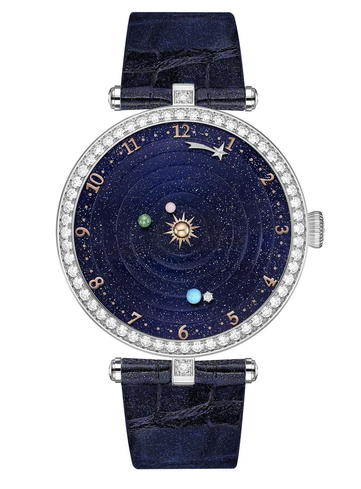 这枚腕表的自动上链机芯搭载着梵克雅宝与Christiaan van der Klaauw合作研发的专用模块,将太阳与邻近行星,包括水星、金星、地球及其天然卫星月球栩栩如生地呈现于眼前。每颗星体均按照其在自然界中实际围绕太阳公转速度而运行。水星围绕表盘运行一周需88天,金星需224天,地球则需365天。此外,这枚腕表最为引人注目的创新 之处非月球莫属,它环绕地球运转一周需时29.5天,日复一日地于星空表盘之上上演华 美耀目的星际芭蕾。