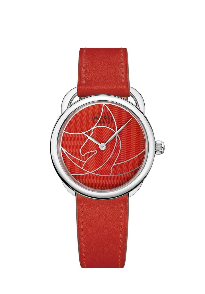 除了Arceau Casaque,Carre H腕表与Arceau Pocket Millefiori怀表都是今年日内瓦钟表展上爱马仕的亮点。Carre H的设计师Marc Berthier今年将方形表壳增大数毫米,在精钢表壳上施以抛光及微粒喷砂处理,玑镂表盘采用直角排列饰纹,更配备拥有细致刻面的指针及阿拉伯数字时标,让腕表呈现出完美的光影效果,并彰显出它独特的流线造型。而Arceau Pocket Millefiori怀表的水晶表盘则运用源自19世纪千花纸镇的古老工艺再现了鳄鱼皮的鳞纹图案,似真似幻,令人炫目。
