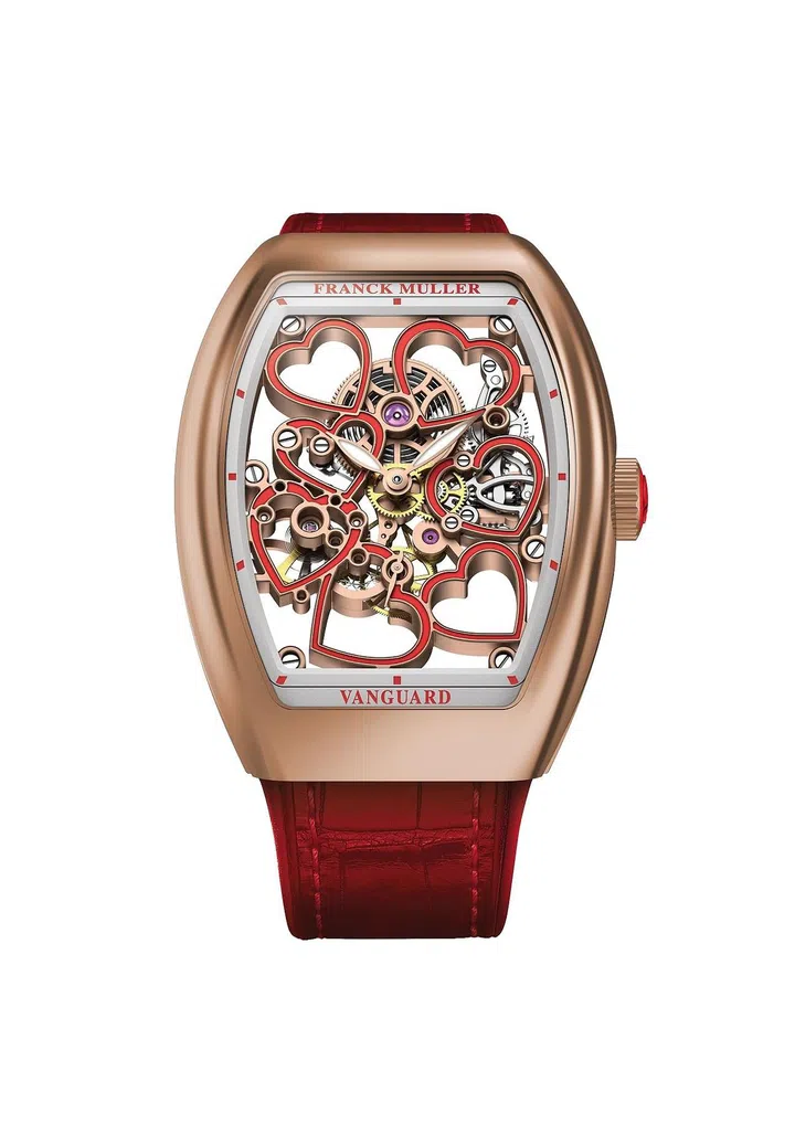 法穆兰(Franck Muller)经典酒桶形表壳,不只镂空露出内部结构,还以七颗心形图案玩转女性复杂而美丽的心情。