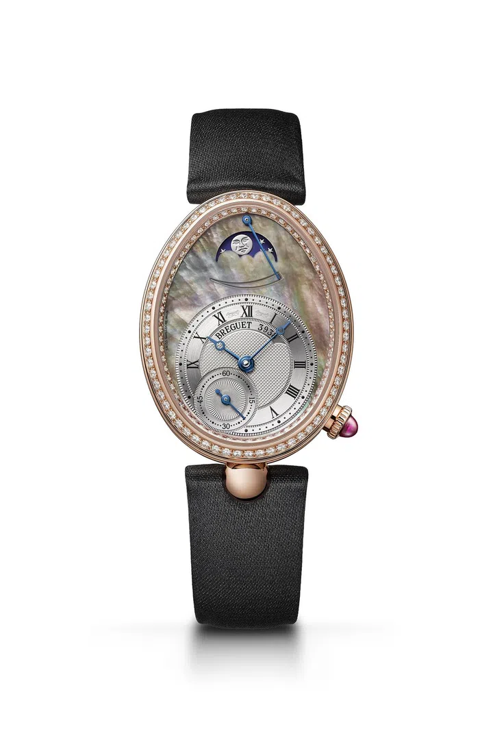 今年,宝玑(Breguet)重新演绎2002年上市的Reine de Naples那不勒斯王后腕表系列。最新版本的8908腕表更加奢华贵气,蛋形表壳以18K玫瑰金铸造,带有精细钱币纹,表圈及面盘内缘镶有128颗圆钻(约0.77克拉),表冠镶以圆顶形红宝石(约0.27克拉),蓝宝石水晶底盖。大溪地贝母及色银金质面盘,带手工鐫刻图案,备有独立编号及宝玑字样。罗马数字时圈,针尖镂空宝玑式蓝钢指针。