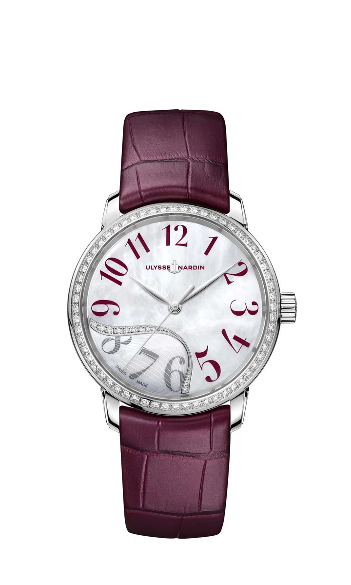 表盘上,珍珠母贝的左下方镶嵌着十颗钻石,激起叶形的波纹,精钢表圈上还镶嵌着76颗钻石,令整只腕表散发着璀璨光芒。蓝色皮革表带搭配超大蓝色阿拉伯数字时标;白色皮革表带搭配灰色数字;石榴红色皮革表带搭配红色数字,与珍珠母贝的华丽色调及钻石的璀璨光芒相得益彰。其中蓝色与深红色款在表盘上都采用了别具一格的双色时符设计,在钻石波纹的上方采用的是于表带相对应的蓝色或深红色,而被波纹围绕的下方时符“6、7、8”则使用与白色珍珠母贝相同色系的灰色,这样的小设计增添了腕表的趣味性,令人回味无穷。玉玲珑每款都是隽永柔美的高贵化身,无论是休闲随意还是隆重的晚装场合,都能够展现女性非凡的气质。
