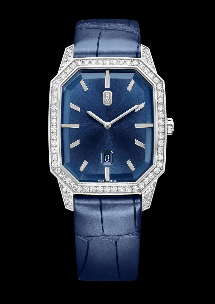 海瑞温斯顿(Harry Winston)与蓝色有着不解之缘,此深厚渊源由来已久。全新Emerald系列腕表的表盘和表带浸染着海瑞温斯顿“希望之钻”的轻灵蓝色调,使佩戴者仿若置身海瑞温斯顿的珠宝世界。瑰丽的湛蓝色表盘散发微妙光芒,映衬着三颗分别镶嵌于3时、6时和9时位置的圆形明亮式切工钻石分外璀璨。表圈、表冠、表耳及针扣共计镶嵌67颗圆形明亮式切工钻石,总重0.53克拉。
