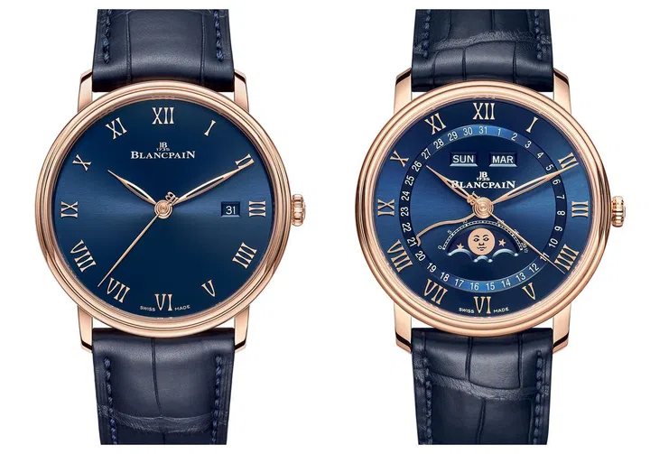 蓝,是宝珀(Blancpain)的身份色。如今,品牌推出 Villeret经典系列中的两枚标志性表款——经典系列全历月相腕表与经典系列大三针超薄腕表,特别打造深邃蓝盘融合豪华红金表壳的全新力作。全新表款皆首次采用了以“宝珀午夜蓝”表盘搭配豪华40毫米红金表壳的设计风格。蓝色象征着高贵与精致,表盘上的太阳放射纹饰打磨工艺又将蓝色诠释得更加深邃与闪耀。腕表的蓝色表盘上饰以红金打造的罗马数字时标及纤细优雅的柳叶针,时针与分针还做了宝珀标志性的高难度镂空处理,秒针上镌刻有宝珀品牌创始人贾汗-雅克·宝珀先生(Jehan Jacques Blancpain)的姓名首字母缩写。此外,腕表还搭配了色调与表盘一样浓郁的午夜蓝色短吻鳄鱼表带。