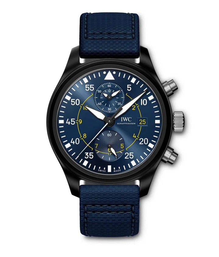 沙夫豪森IWC万国表正式成为美国海军“蓝天使”特技飞行队 (“Blue Angels”US Navy Flight Demonstration Squadron) 的官方合作伙伴。为了庆祝这次合作,IWC万国表推出飞行员计时腕表“蓝天使”特别版(Pilot's Watch Chronograph Edition "Blue Angels"),腕表配备抛光黑色陶瓷表壳,搭配蓝色表盘。表盘外圈与内圈分别独立显示分钟及小时,设计灵感源自早期的观测员腕表 (Observer’s Watch)。腕表配衬蓝色小牛皮表带,表壳背面刻有“蓝天使”的徽章。