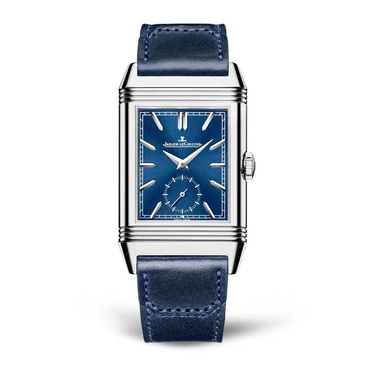 积家(Jaeger-LeCoultre) 经典Reverso翻转系列今年迎来三款新作,其中这款Reverso Tribute Duoface翻转系列双面双时区腕表的双面表盘分别显示两个时区的时间,由同一枚机芯驱动,而如此精密复杂的积家854A/2型机芯,竟藏身于厚度仅为10.3毫米的纤薄表壳之中。正面表盘的6时位置设有小秒针显示窗,而位于背面表盘的日夜显示功能让佩戴者能够轻松区分出发地的昼夜情况。