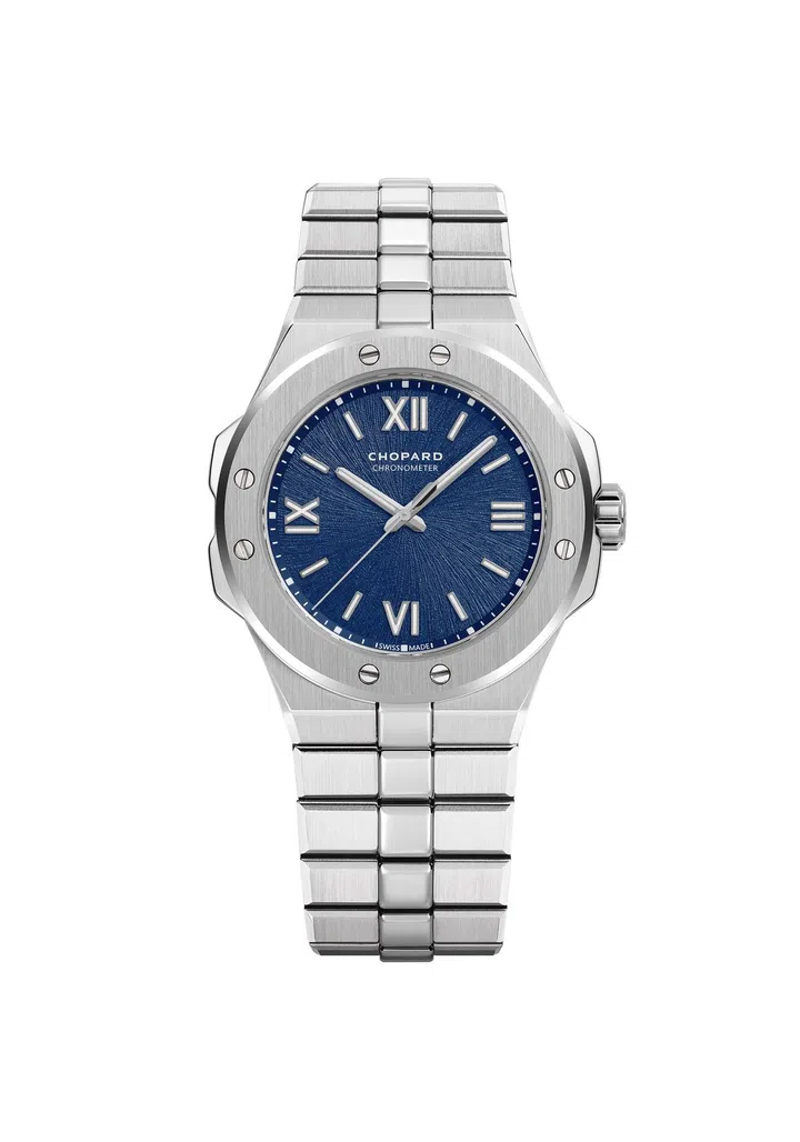 萧邦(Chopard) Alpine Eagle系列的设计精炼而现代,诸多元素呼应阿尔卑斯雄鹰及其群落生境。腕表采用品牌潜心研制数年的Lucent Steel A223精钢打造而成,此款独创金属赋予腕表极高的硬度与皮肤兼容性,且所有平面均经缎面打磨,营造出细腻的光影效果。表盘纹理压印太阳纹图案,设计灵感源自鹰眼虹膜,搭配以鹰羽为造型的指针设计,将桀骜雄鹰渗透至腕表的每一个细节之处,以自信钢炼的外形设计折射时代精神,致献所有志高存远、极富远见的当代绅士。
