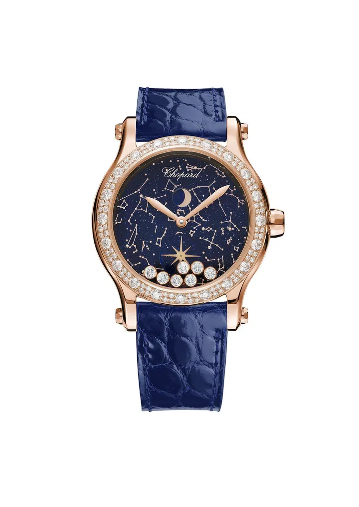 萧邦(Chopard)Happy Sport系列迎来一款全新珠宝腕表Happy Moon,表盘以深蓝色泽的金星玻璃打造,玻璃体内蕴涵着金光闪闪的结晶颗粒,在此款作品中幻化成诗意盎然、璀璨耀目的浩瀚天幕。金质铆钉与金丝点缀表盘,共同勾勒出北半球广为人知的纷繁星座,令夜空愈加迷人。北极星作为天空北部的一颗亮星,自古以来,地球上的旅人靠它的星光来指引方向,Happy Moon腕表以此著名星宿为灵感,将6时位置的小秒针设计成北极星形状,并采用经典纹理雕金工艺润饰。最后,Chopard品牌标志下方设有月相显示盘。