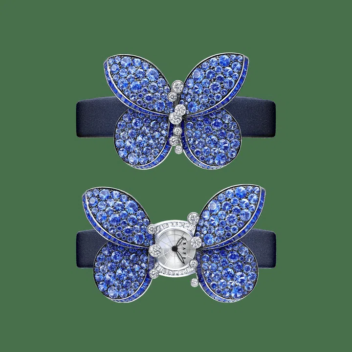 格拉夫(Graff) Princess Butterfly腕表的蝶翅镶满圆形粉红色蓝宝石,并以隐形镶嵌的梯形切割粉红色蓝宝石勾勒轮廓,成就栩栩如生的立体效果。一按匠心独运的宝石开关装置,便能欣赏到粉红色贝母表盘,与紫色缎料表带完美映衬。