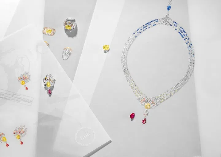 蓝宝石是宝石界中拥有最广泛颜色的宝石种类之一,几乎包含所有能想像的色彩。朦胧暮光主题项链镶嵌27颗不同颜色天然蓝宝石,呈现出渐变的独特造型。其中还有三颗独特的帕帕拉夏蓝宝石(亦称莲花刚玉),呈现出宛若晚霞色调,极为罕见。 同系列高级珠宝项链和耳环也以柔和的色调、多色蓝宝石的混 合镶嵌以及精湛的切割工艺呈现出迷人色彩。